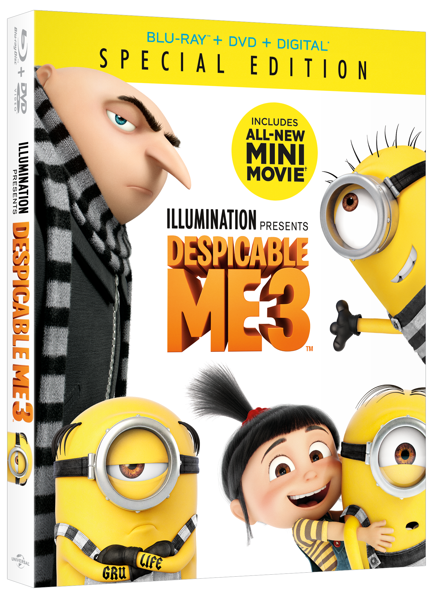 Despicable Me 3 is now available on Digital, 4K Ultra HD, Blu-ray™, DVD and On Demand December 5, 2017. The characters beloved by everyone – Gru, his wife Lucy, their three adorable daughters—Margo, Edith and Agnes—and the Minions provide hours of family fun in this heartwarming comedy. After he is fired from the Anti-Villain League for failing to take down Balthazar Bratt, the latest evil mastermind to threaten humanity, Gru finds himself in the midst of a major identity crisis. But when a mysterious stranger shows up to inform Gru that he has a long-lost twin brother — a brother who desperately wishes to follow in his twin’s despicable footsteps — the former super-villain rediscovers just how good it feels to be bad. Despicable Me 3 is the ultimate holiday gift, with almost an entire hour of exclusive bonus features including an all-new mini-movie, a never-before-released deleted scene, and much more!