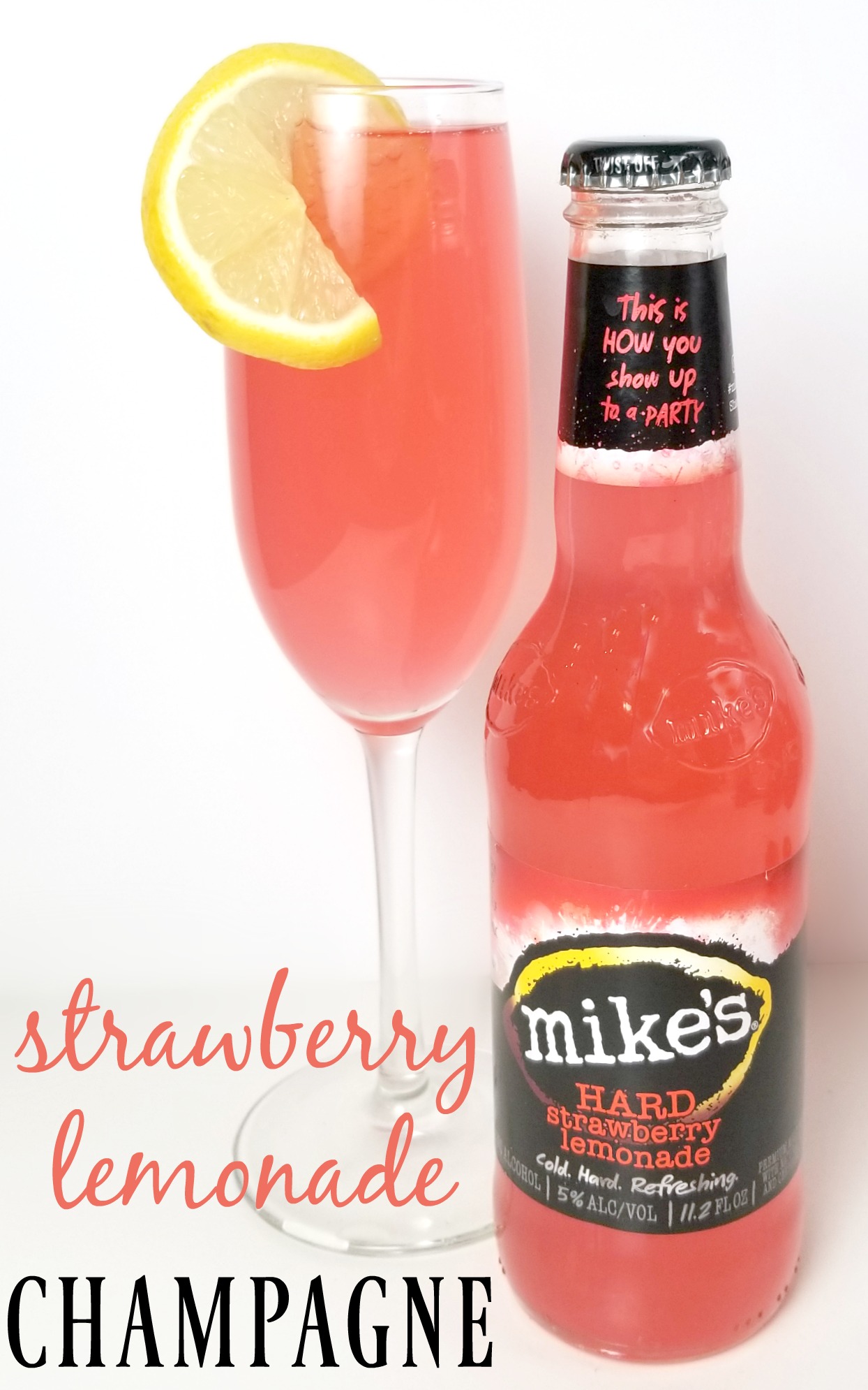 To make strawberry lemonade champagne, just fill your flute two thirds full with Mike’s Hard Strawberry Lemonade and top your glass off with the champagne. You can even add some lemon zest or muddled strawberry at the bottom of your glass if you’d like to. The strawberry lemonade flavor is my favorite Mike’s Hard Lemonade, but you can use the other flavors if you prefer.