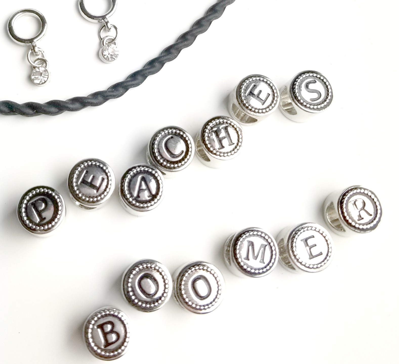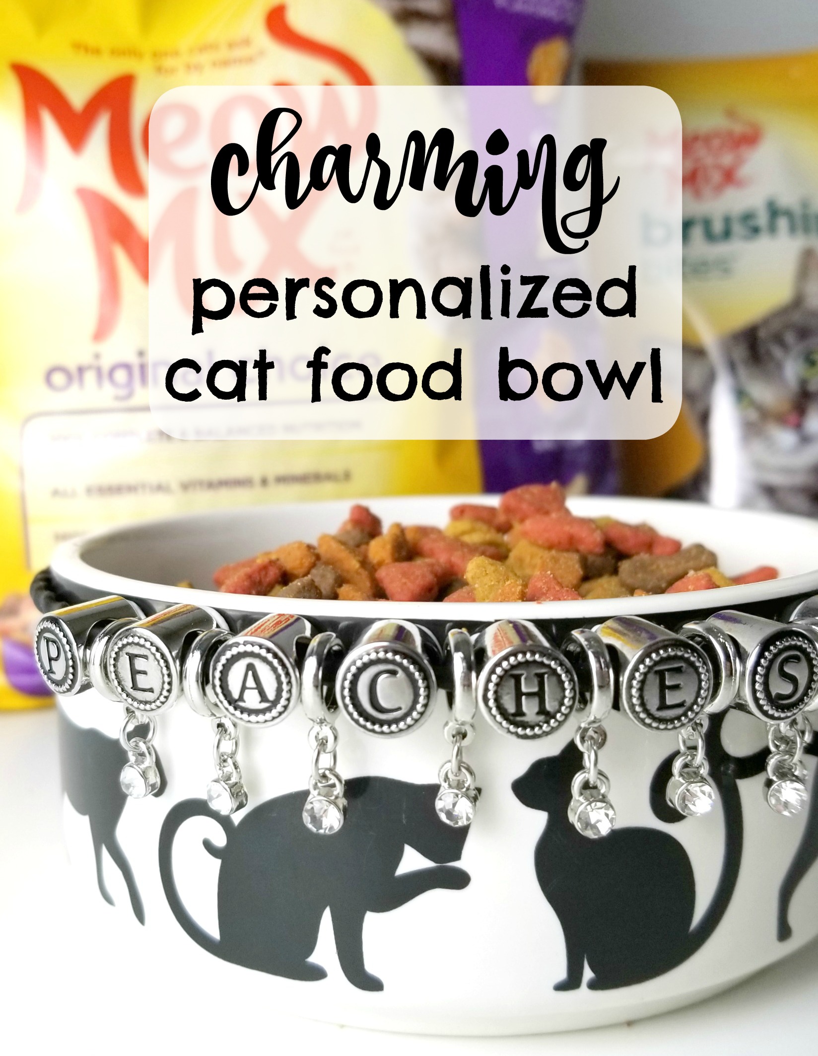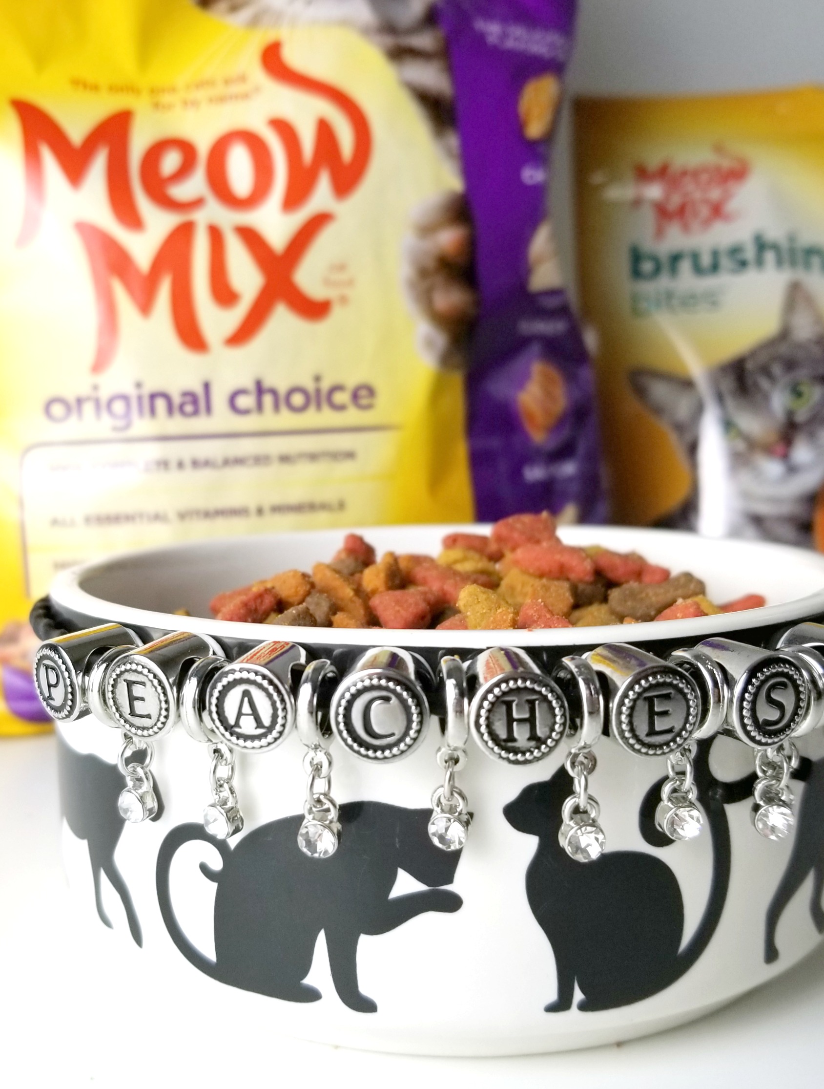 In between cat and child cuddling sessions I thought it would be fun to do some crafting and came up with the idea to add some sparkly personalization to Peaches’ and Boomer’s cat food bowl. I regularly do fun cat crafting projects and have made things like a ribbon wand for playtime and a no-sew cat bed to add some cushiony comfort to their cat tower. Though I can probably buy most of what I make, I enjoy these simple DIY projects. With all the crafting I have done in the past, I’ve never decorated their cat food bowls before so I thought it would be fun to do. I thought about sponge painting a white bowl and painting on their names, but my hand isn’t very steady so I decided to use letter charms instead, and I love how it turned out.