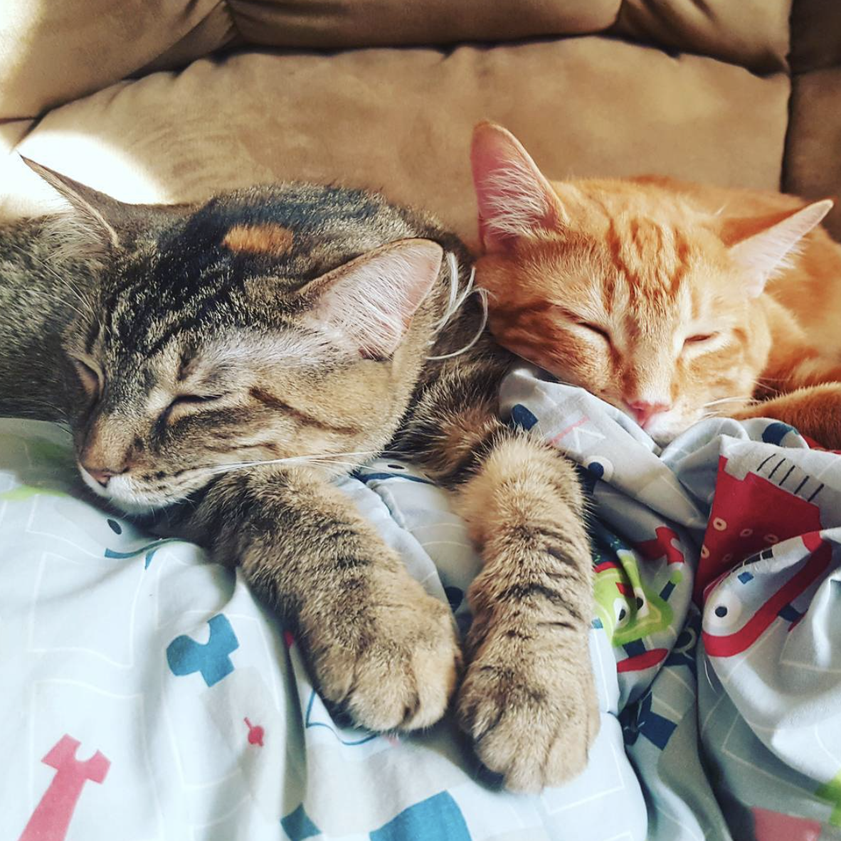 So cute, right? This is the look Boomer gives me when she wants attention. She’ll stare right at you until you say her name and then she happily climbs on top of you, rubbing into your hand to indicate she’d like to be petted. Peaches on the other hand makes it clear what he wants by rolling over onto his back and stretching so that his belly is right side up. He will wiggle himself around next to you until he gets the belly rubs he is looking for. I love cuddling with them and showing them love, just like I do my two little human babies (well, I guess my boys aren’t really babies anymore though…).