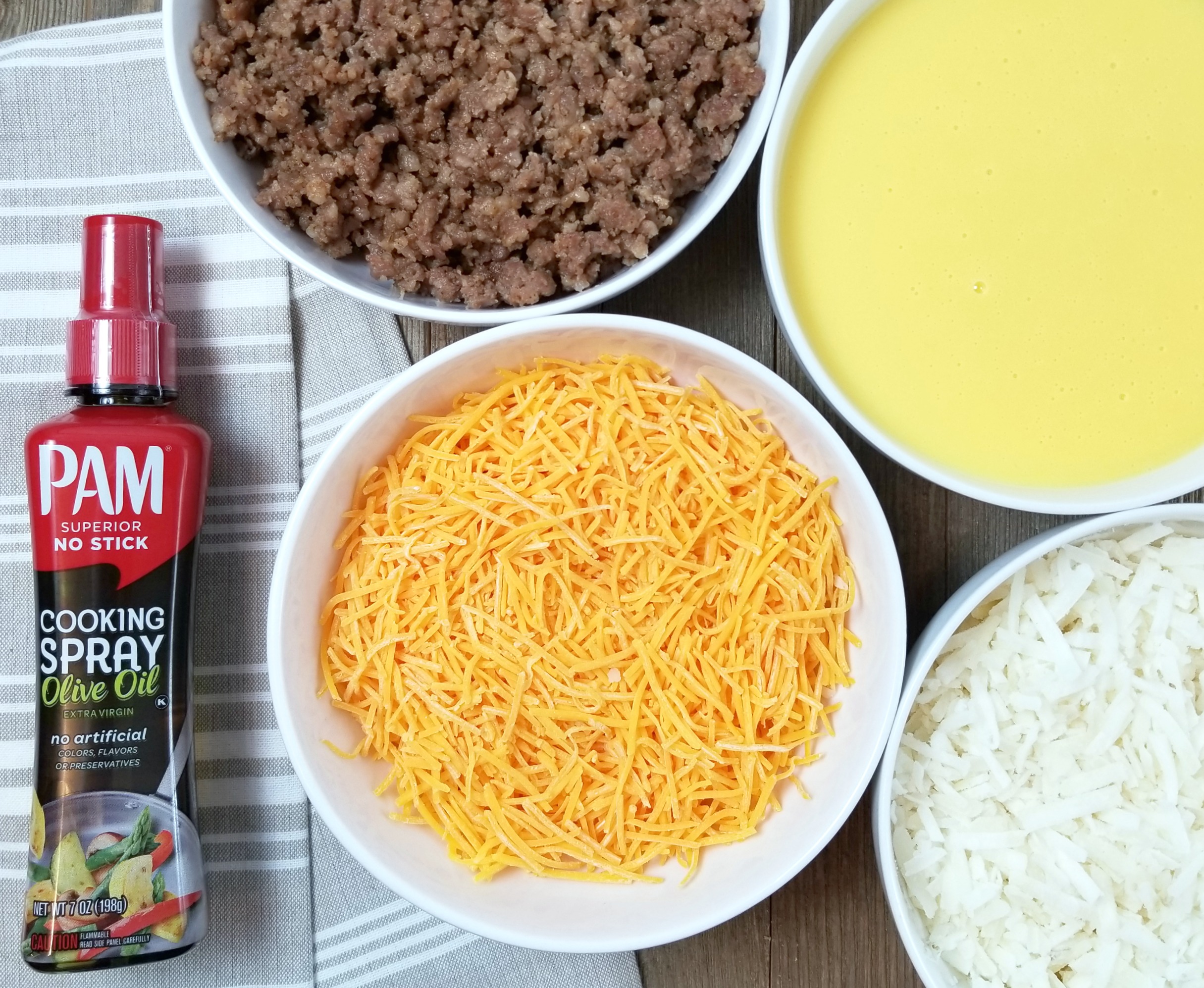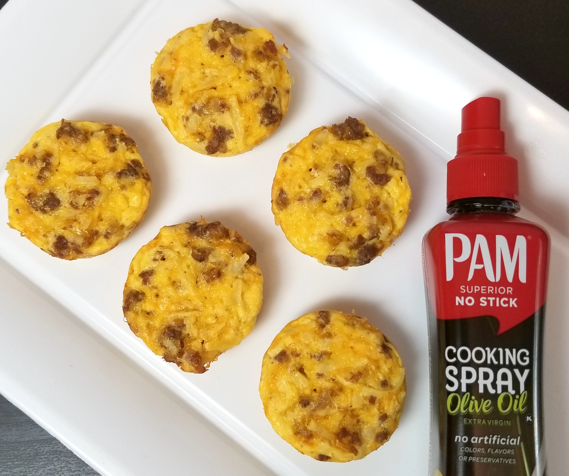 Another tip of mine? Don’t forget the cooking spray in the muffin tin! We used the NEW PAM® Spray Pump Olive Oil. This new product, from a brand I’ve used in my kitchen for years, provides the superior non-stick cooking experience I’m used to without adding a ton of extra calories and has no artificial colors, flavors or preservatives. It’s my secret to getting the muffins to slide out of the muffin tin – even when there’s cheese in them!