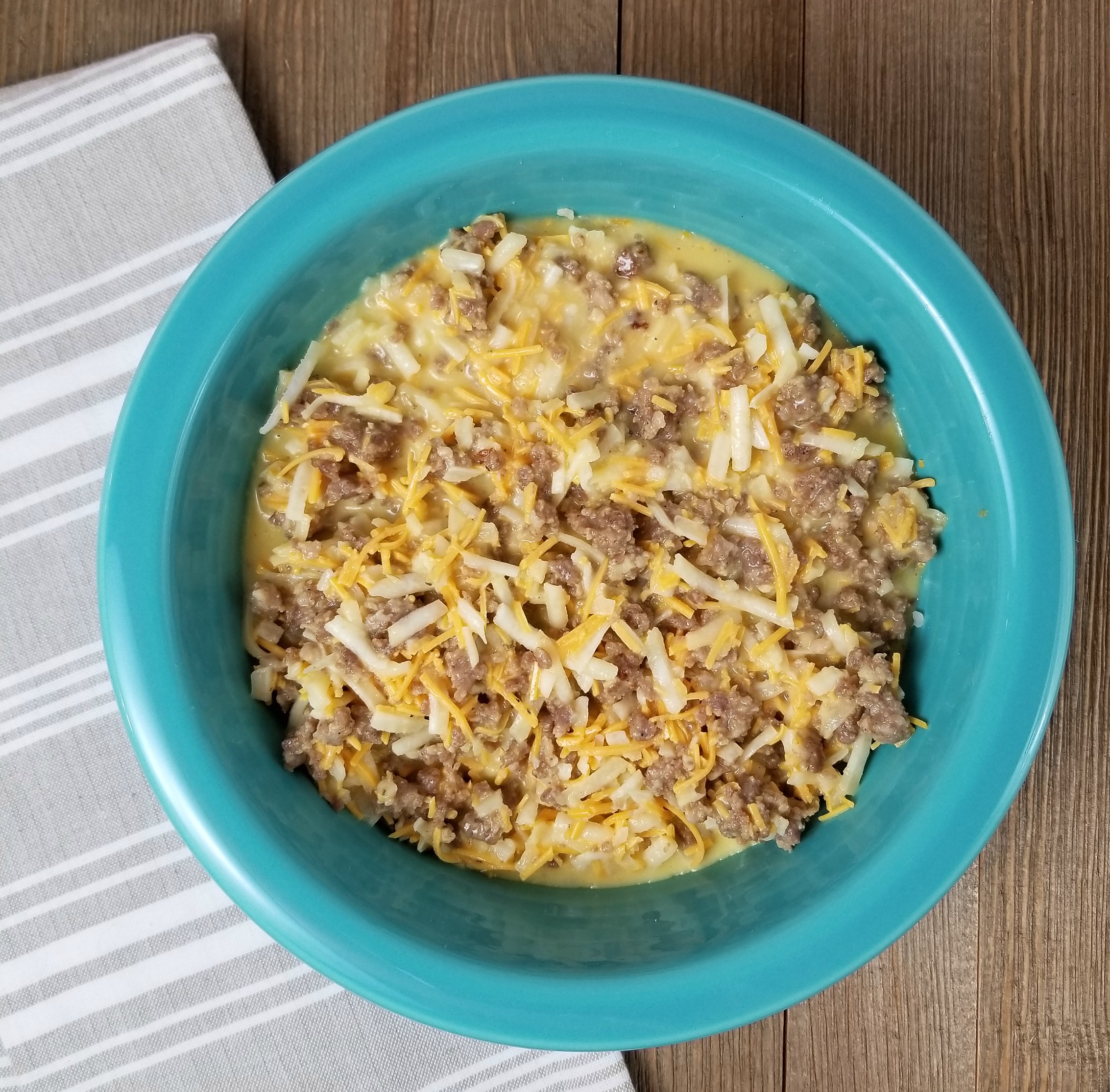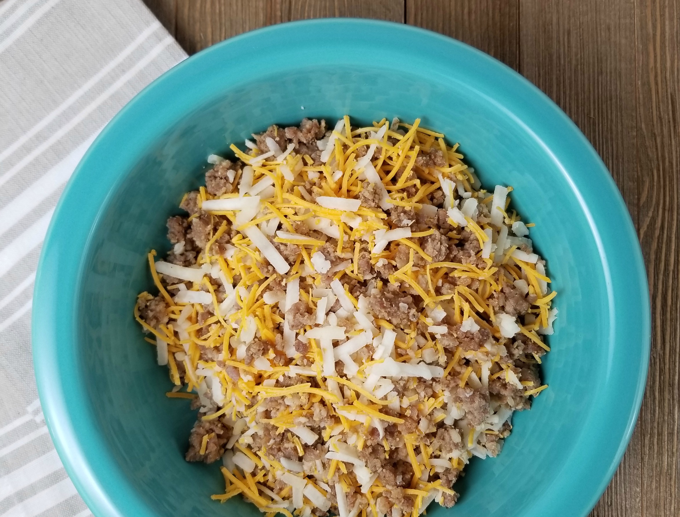 2) Mix hashbrowns, sausage crumbles, cheese, and seasonings.