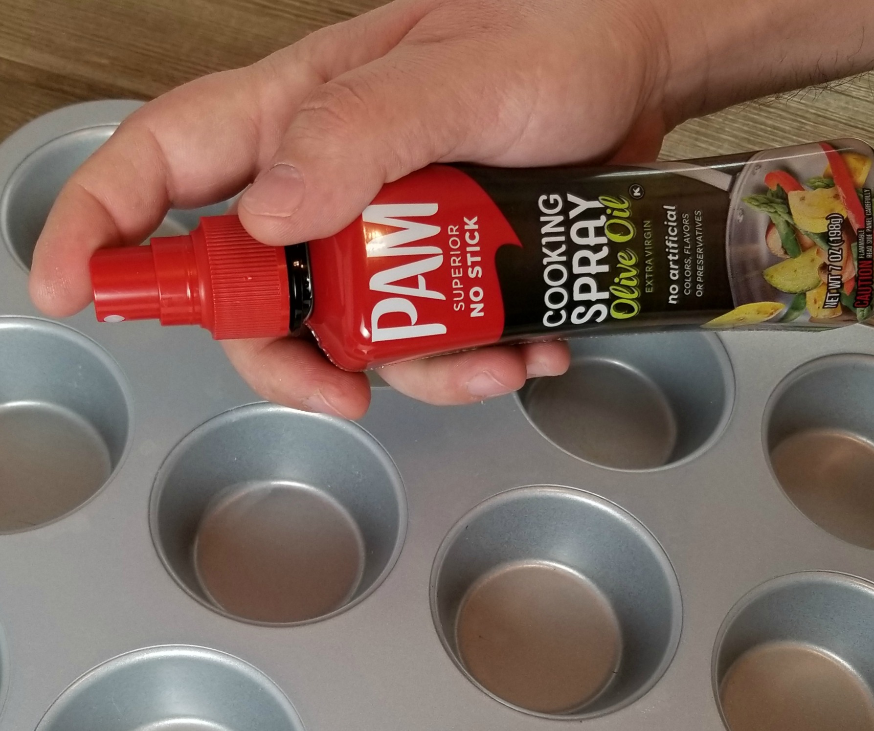 4) Spray muffin tin with PAM Spray Pump Olive Oil to keep the muffins from sticking to the pan. (The non-aerosol PAM Spray Pumps let you control how much you use to manage added fat and calories!)