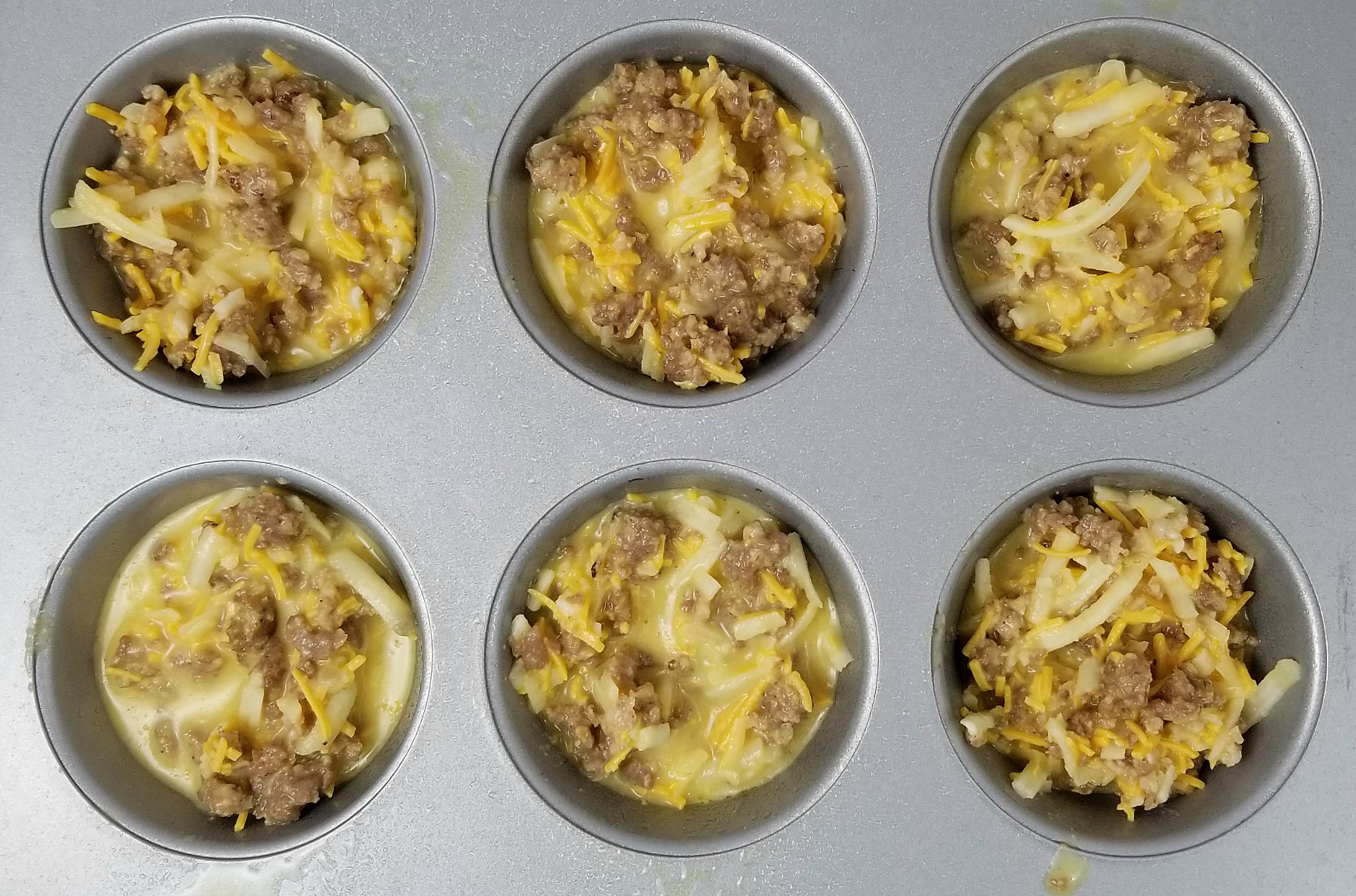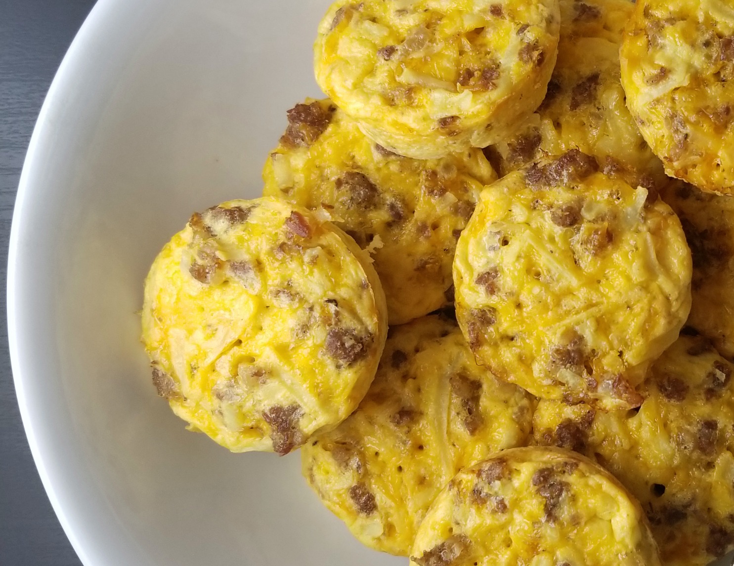 There are many variations that you can make of these breakfast muffins by omitting or adding ingredients. You can add veggies for a healthier muffin or substitute bacon for the sausage crumbles (because who can say no to bacon?). One way to get these in the oven even quicker is to use liquid eggs and pre-cooked sausage crumbles, which is what I did, to save a few steps. In less than 5 minutes of prep time, hot breakfast is made!