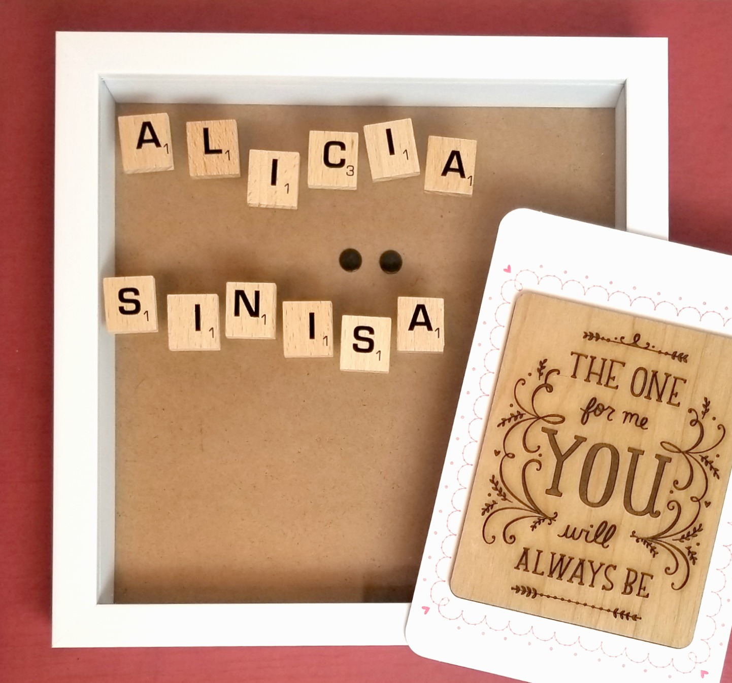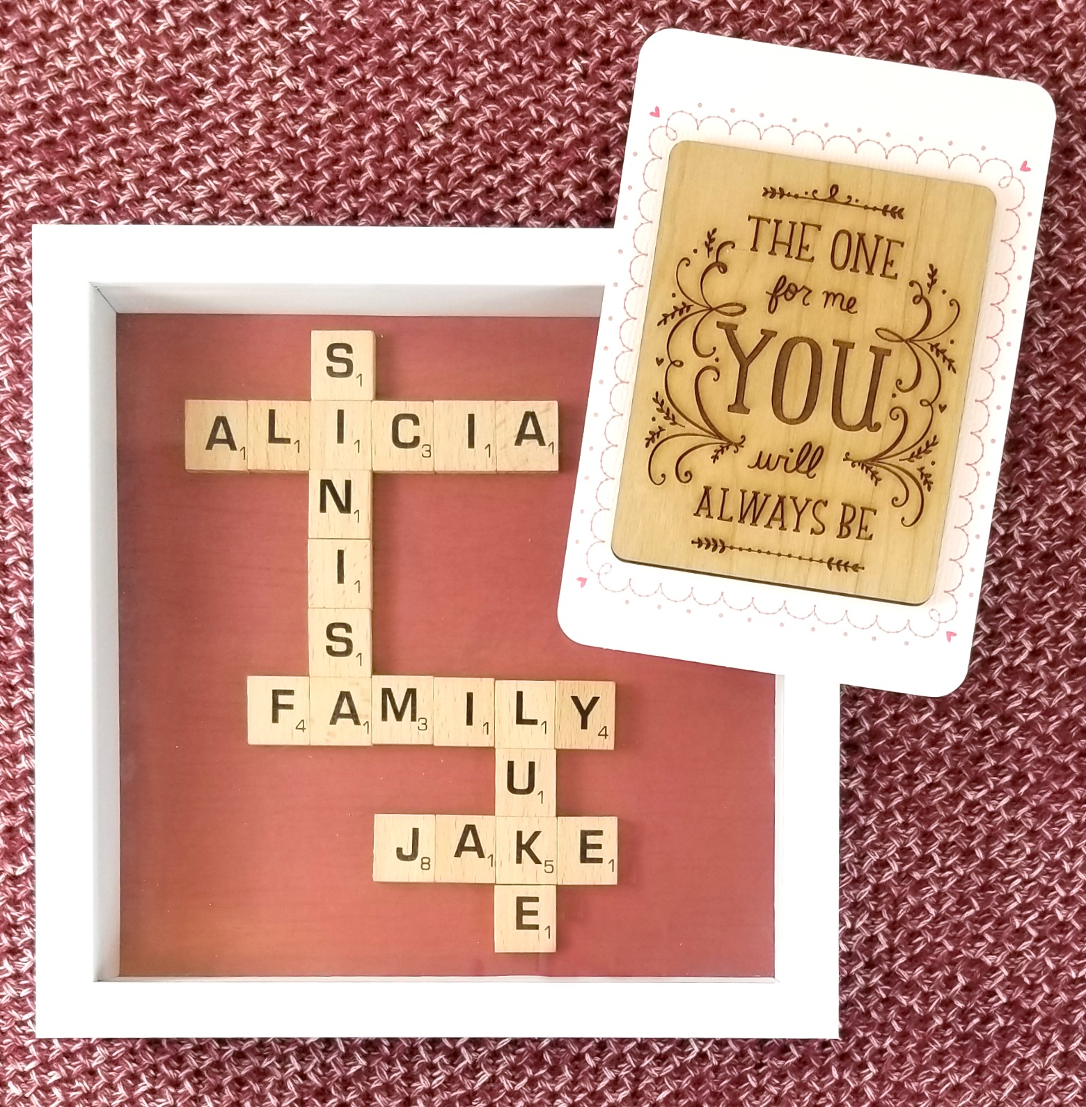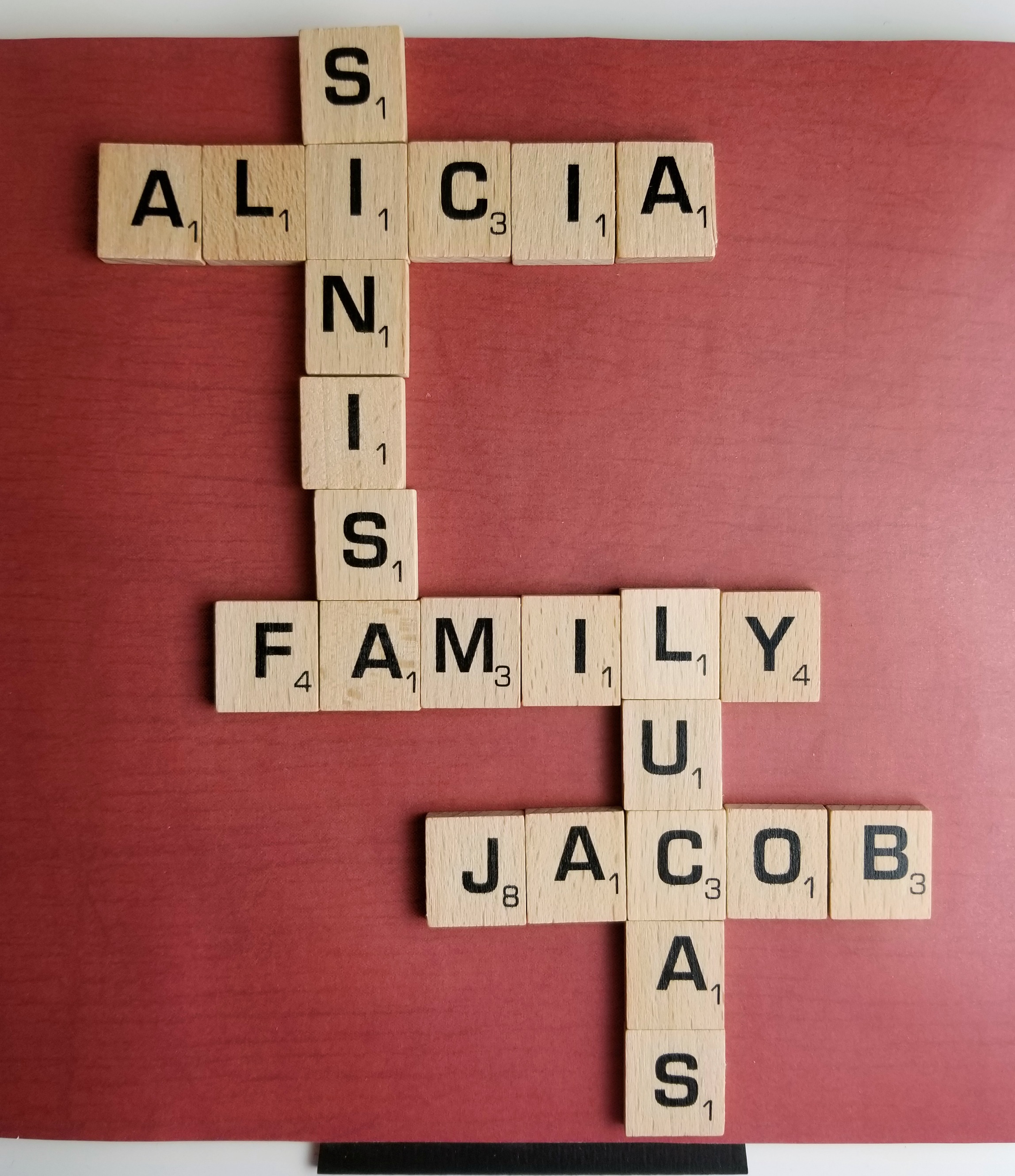 I love cards because you can write special messages in them and another favorite thing to give is personalized gifts, like this letter tile craft. The craft itself is pretty easy to put together but does require some planning when it comes to tile placement (which I learned the hard way lol). I was originally going to just put “Alicia”, “Sinisa” and “Love” but that seemed too empty so I decided to add the word “Family” and add my boy’s names in as well. Everything looked like it fit but then I went to put the frame on and discovered some of the pieces were too close to the edge so I had to use their nicknames so that everything would fit.