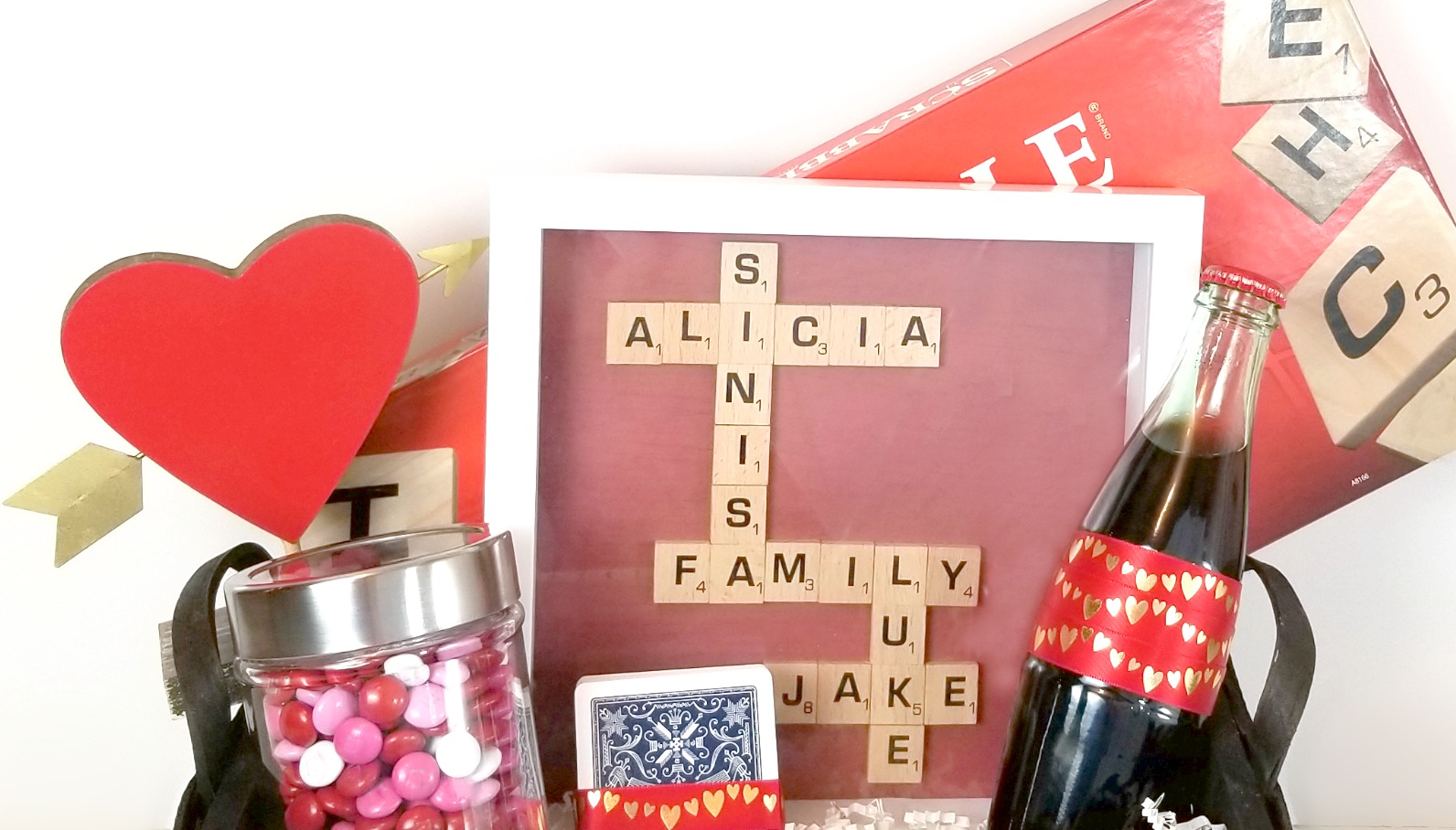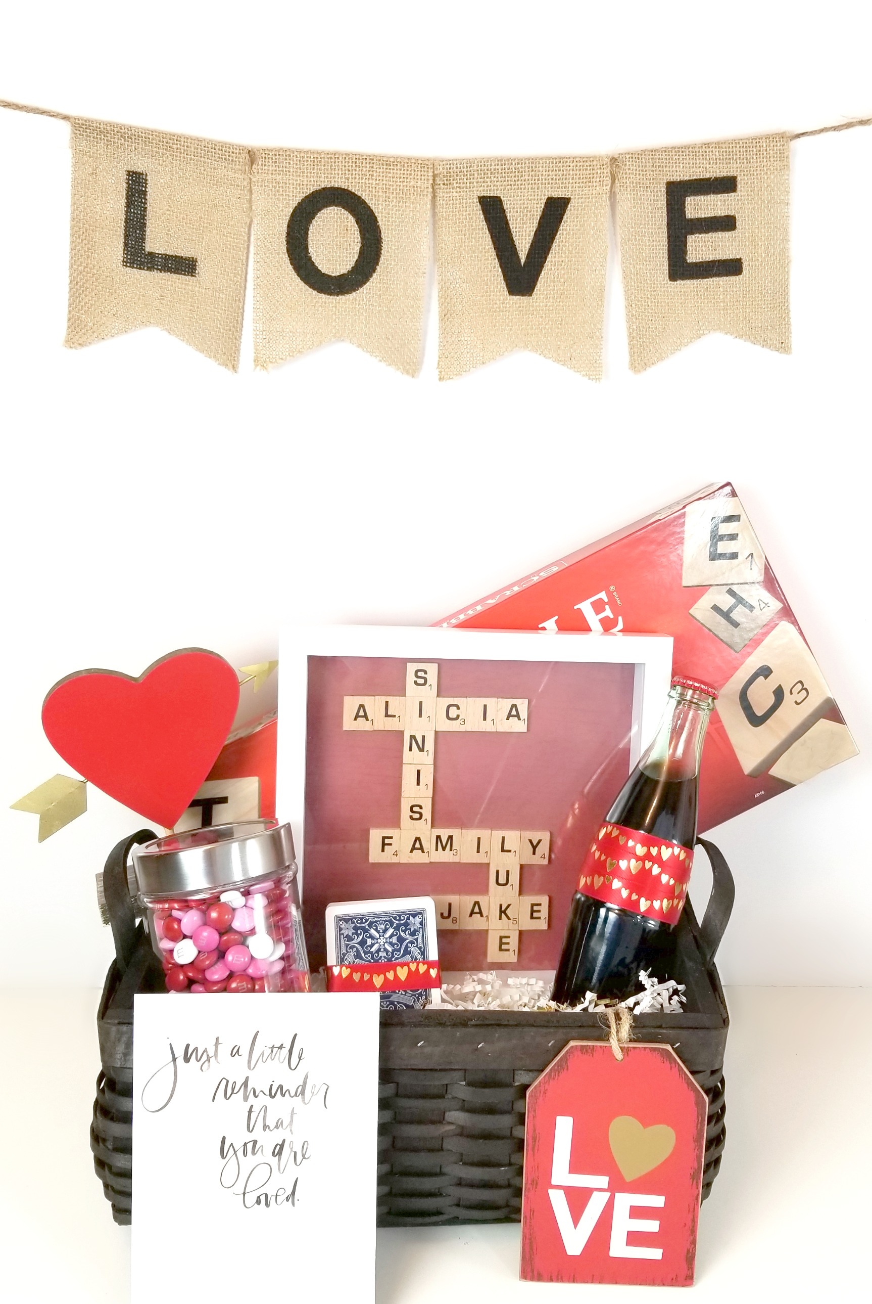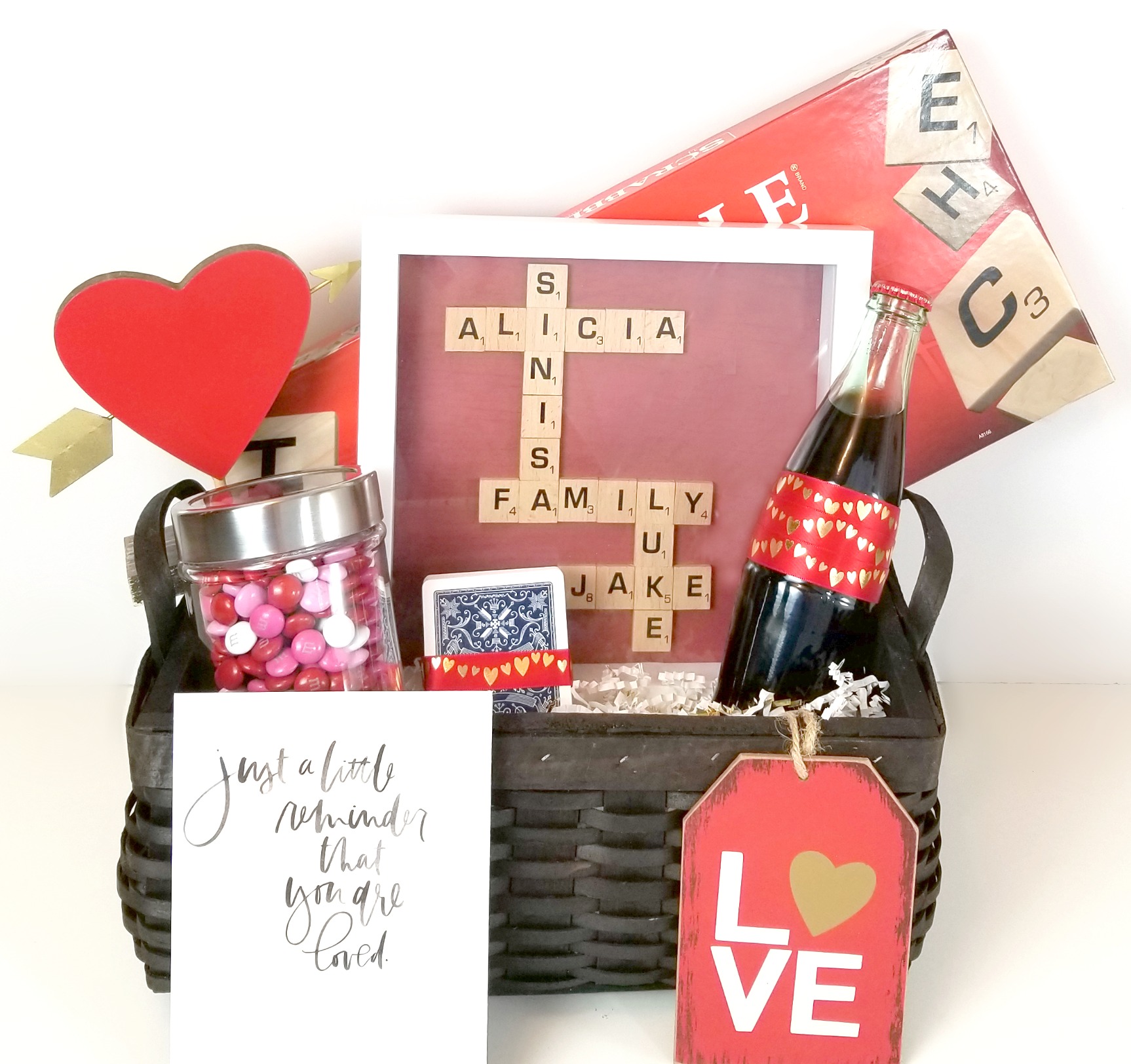 When you are done crafting, it’s time to put the basket together. Along with the frame, I added a snack, something to drink, a board game, a deck of cards and a cute Valentine’s decoration.