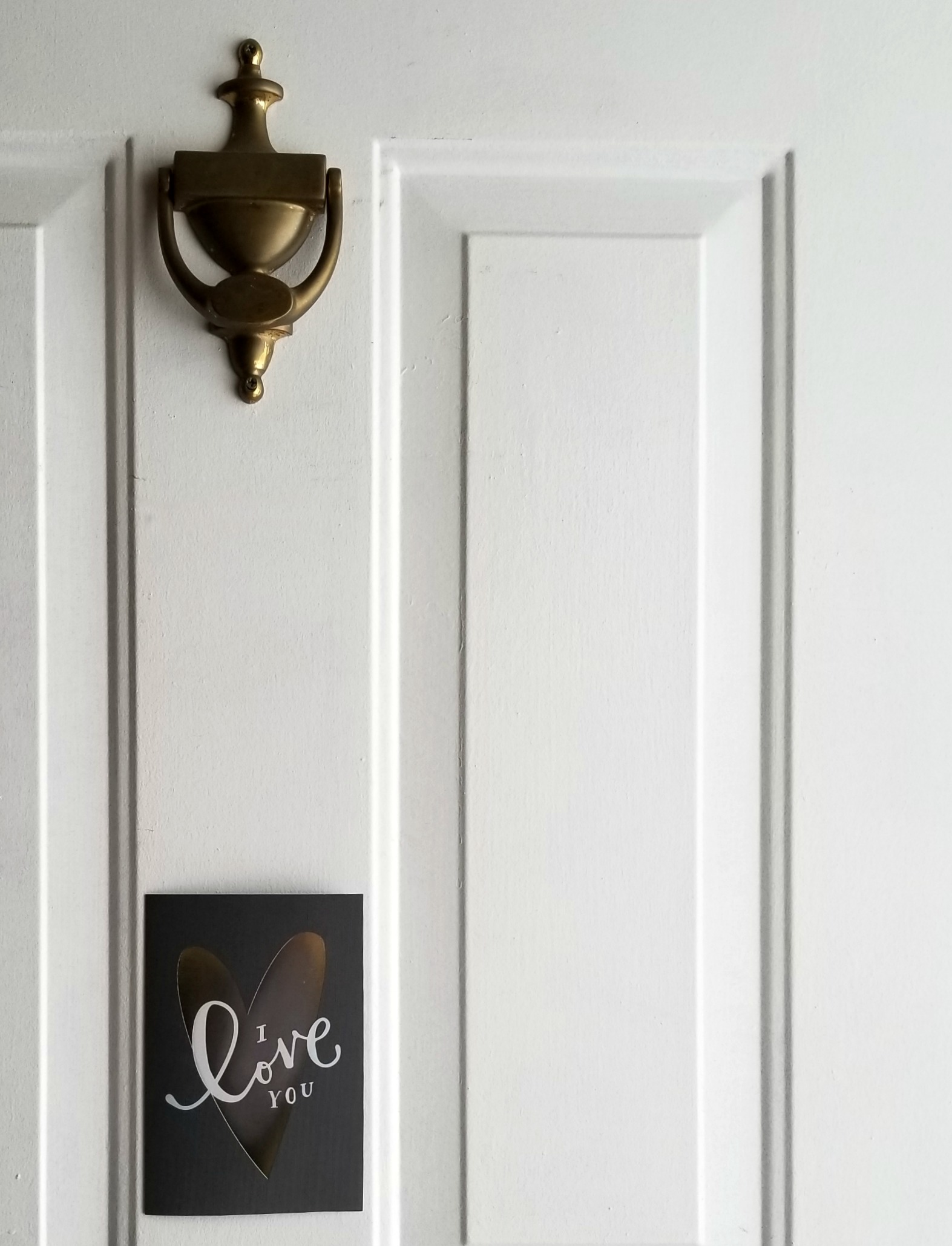 I wrote notes in a few Hallmark cards and hid them around the house, with each card giving a hint of where he could find the next card. The first place I left a hint was on the front door so Sinisa would see it right when he came home from work.