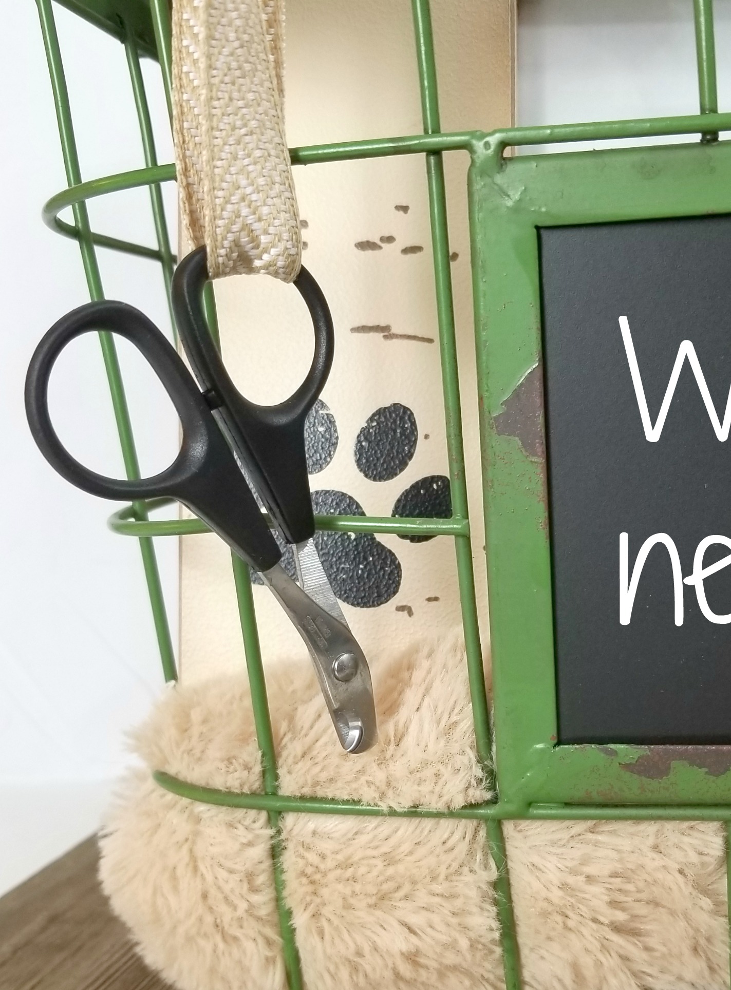 I included a pair of nail clippers and a brush in this gift basket. Since both items are small I hung them on the outside of the basket with decorative ribbon. Other grooming items could include cat cleansing wipes or even a lint brush for the new pet parent who will soon discover that black pants and pets don’t mix :)