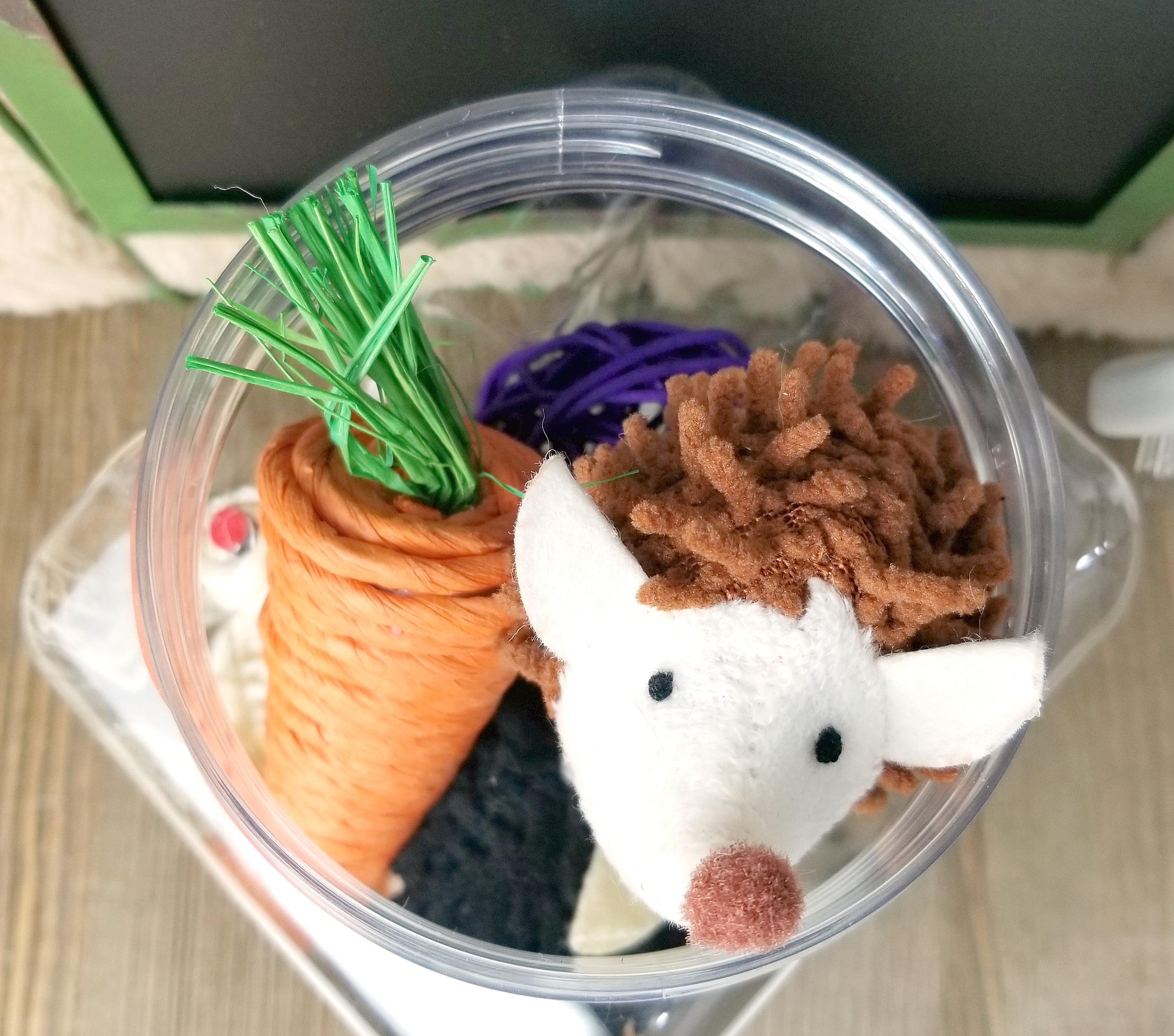 I filled a little plastic jar with small toys because I know from experience that cat toys tend to go missing quite easily (though I’m guessing the majority of them lost in our home could probably be found under the couch!) Ā Kittens have a lot of energy so little balls and other toys will get a lot of use and putting them in a small container makes it easy to give them and then gives the new pet parent something to hold them in.