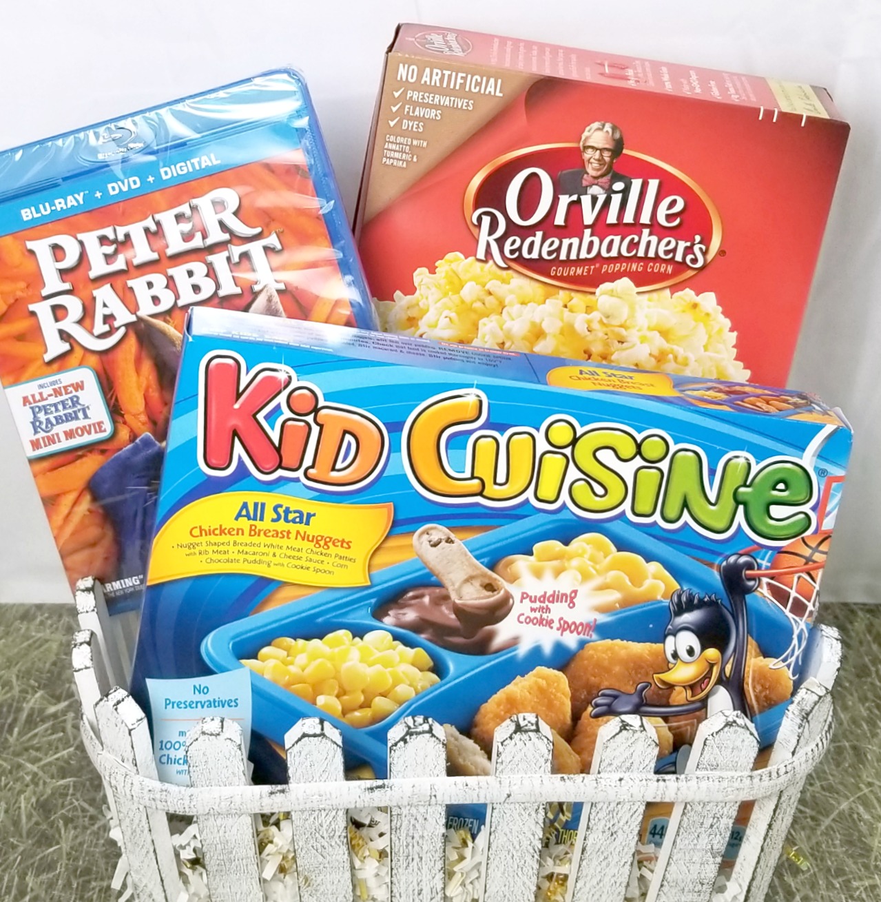 I put together a cute little gift basket to surprise my boys with my movie selection for the week. Along with the Peter Rabbit movie, I added in a couple of their favorite frozen meals from Kid Cuisine, including Luke’s favorite- the Kid Cuisine All Star Chicken Breast Nugget Meal, for the boys to enjoy before movie night (because who wants to be doing the dinner dishes when they could be enjoying time with their family?!). Kid Cuisine serves up kids’ all-time favorites, many with full servings of vegetables. With these easy meals, you know you’re choosing dishes that will satisfy your kids. Plus, they usually have a fun dessert that kids love!