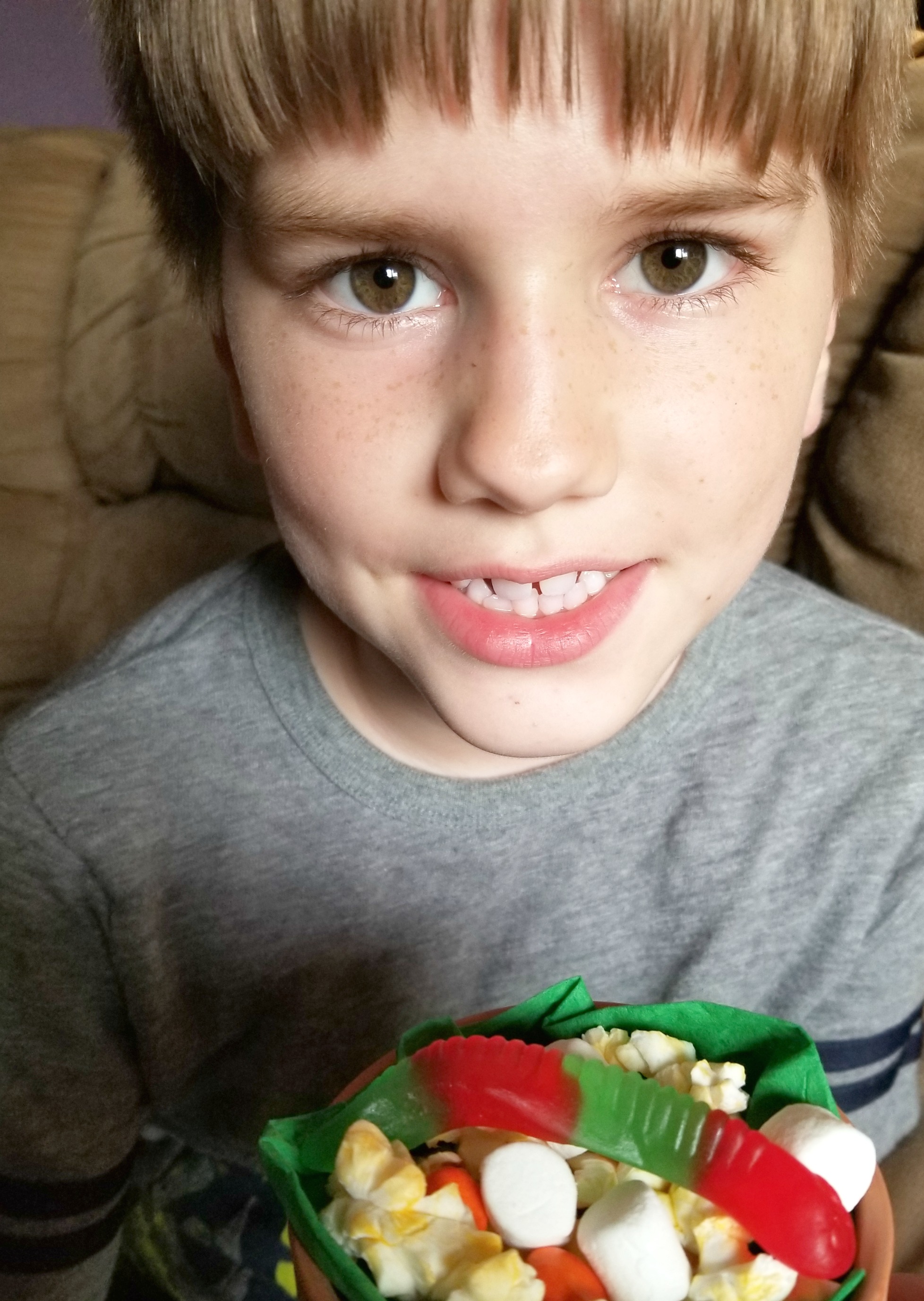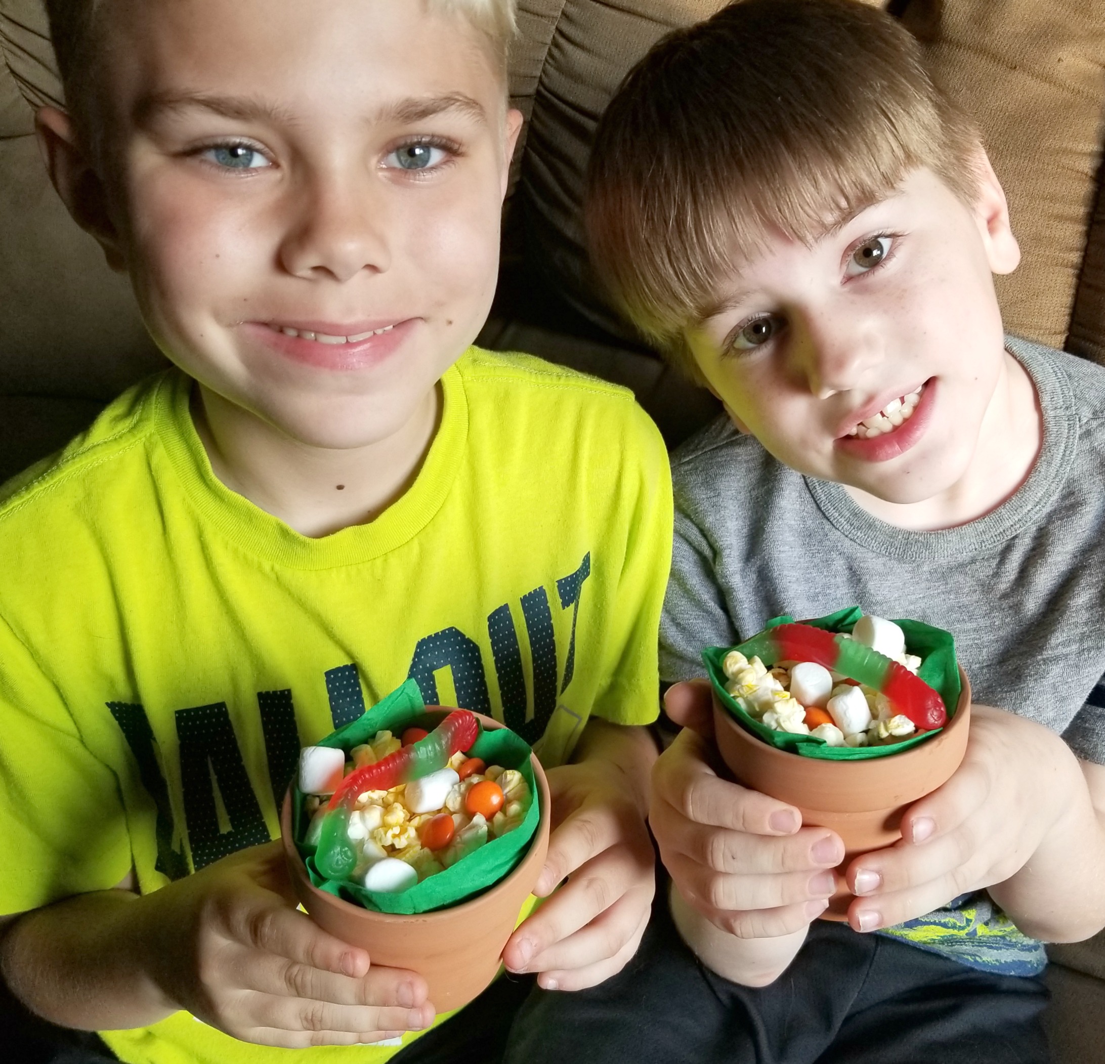 For the mix-ins I set out chocolate cookie pieces (to represent dirt but just not as messy as crushed cookies), gummy worms (like you’d find in the soil), mini marshmallows (aka bunny tails), and candy pieces (with orange ones to represent carrots). The boys favorite part of the evening was creating their own special popcorn mix!