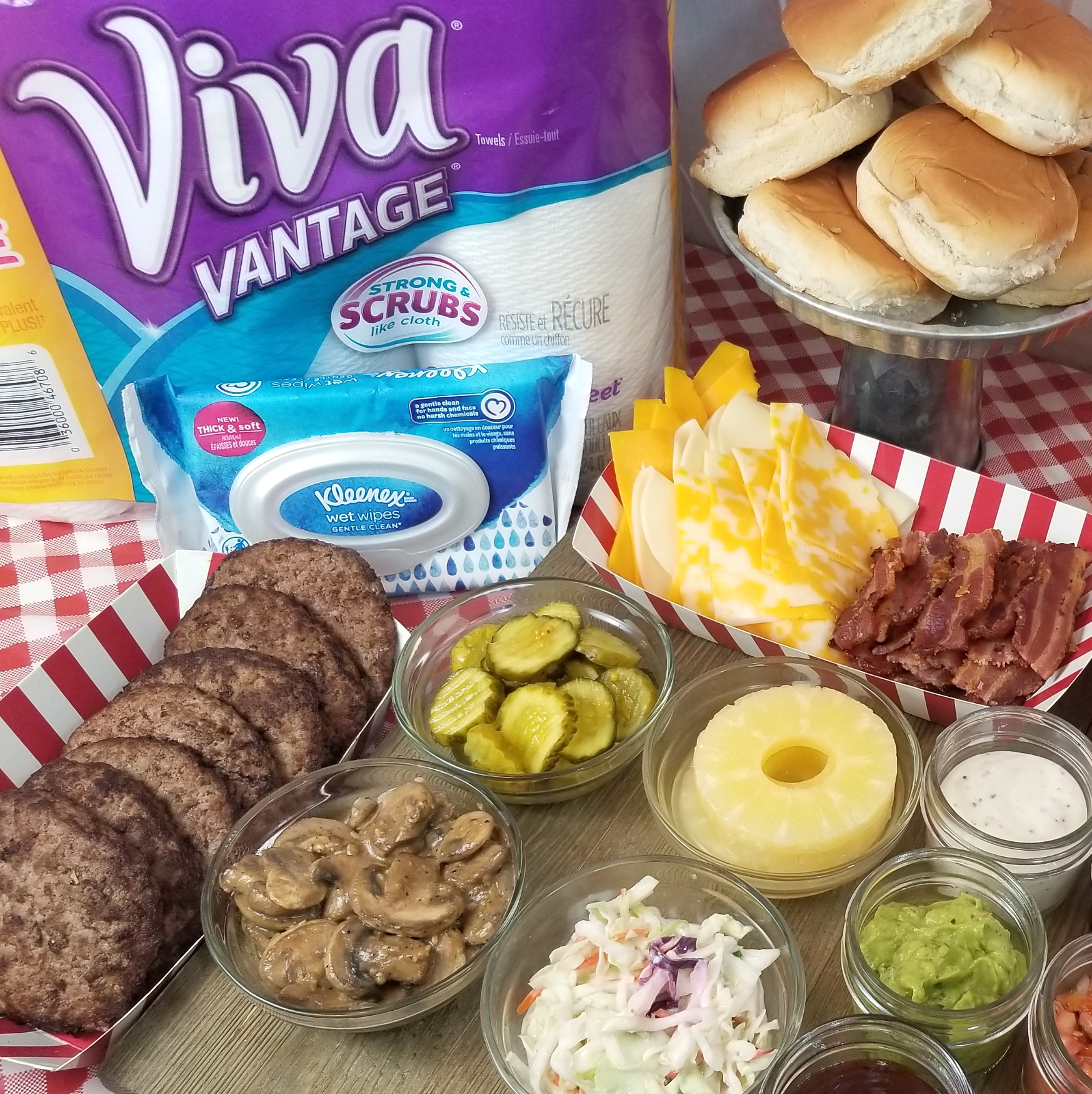 Putting the burger bar together was easy. I headed to Kroger and got pre-shaped burger patties from the meat department, buns, and all the burger toppings that I needed and we didn’t already have. I also bought New Kleenex® Wet Wipes Gentle Clean and VIVA® Vantage® Big Roll Paper Towels for all the messes that were sure to happen (because can anyone eat a burger with all the fixings and NOT have everything fall out the bottom of their bun and drip all over their hand?!)