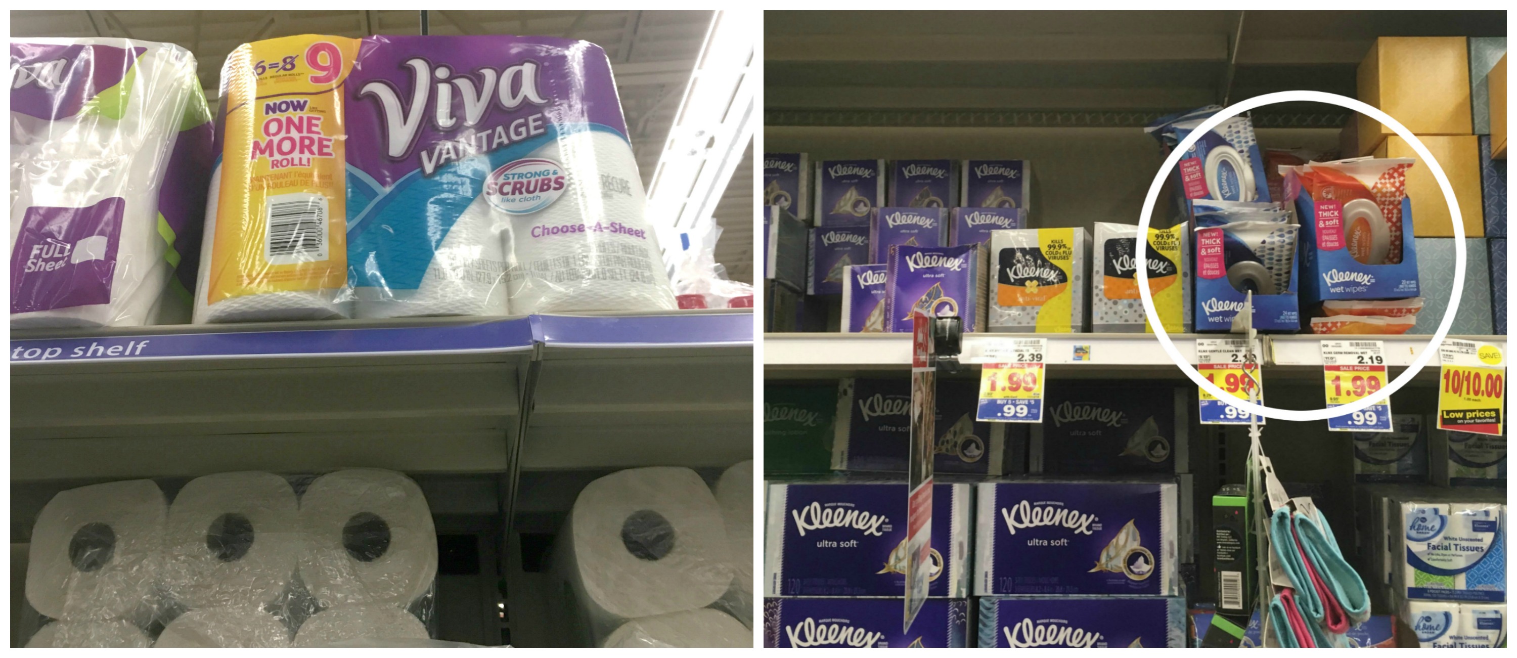 Thankfully I had grabbed everything I needed at Kroger. I found the Kleenex Wet Wipes in the facial tissues aisle next to boxes of Kleenex tissues and the VIVA® Vantage Paper Towels on the top shelf in the paper towel aisle.