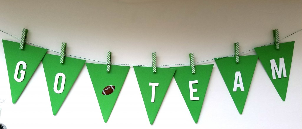 Walmart has a plethora of football tableware and decorations and I chose to do some quick DIY projects as well. I made a colorful banner that says “Go Team” using some green paper and letter cutouts which I hung from string using cute little clothespins.