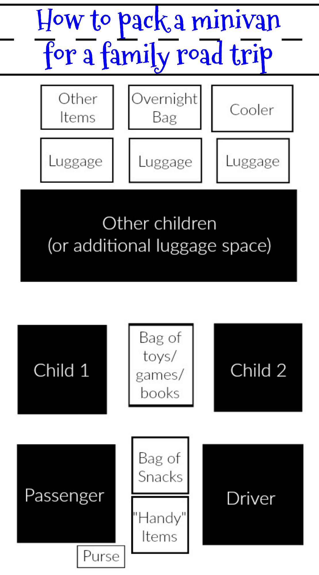 The second tip is to pack the car in a thoughtful manner. I know when you are in a hurry to get on the road it’s easy to just throw things in the car but resist the urge to do that. Trust me, a few minutes of planning will make the trip easier. I’ve provided a diagram (above) of how I pack our minivan, and I want to share a few tips that are especially helpful on longer road trips.