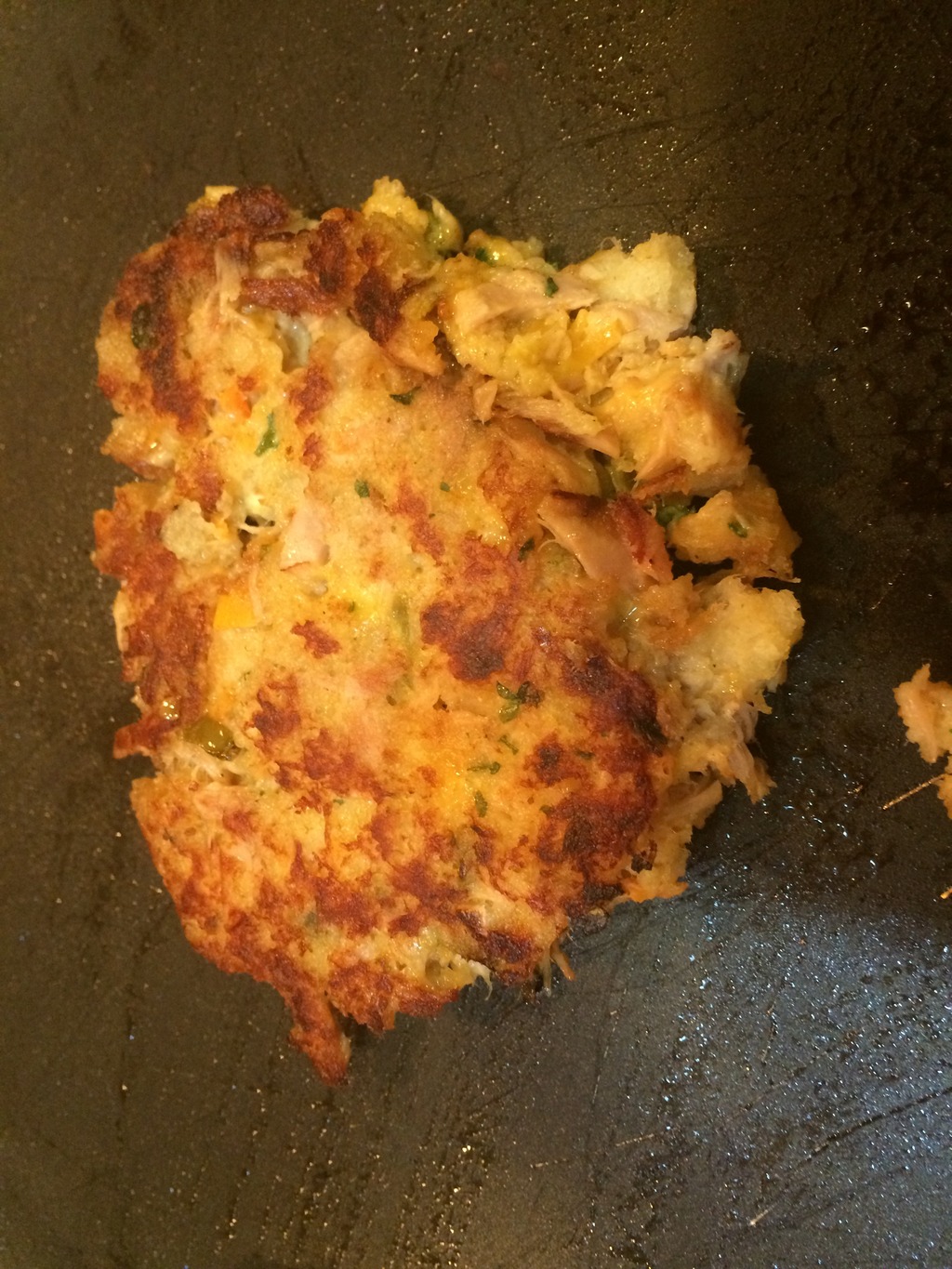 Once the pasta and the sauce were combined it was time to fry up the tuna cakes. To do this, use a non-stick skillet and an ice cream scoop to make portions. Cook them on both sides until golden brown.